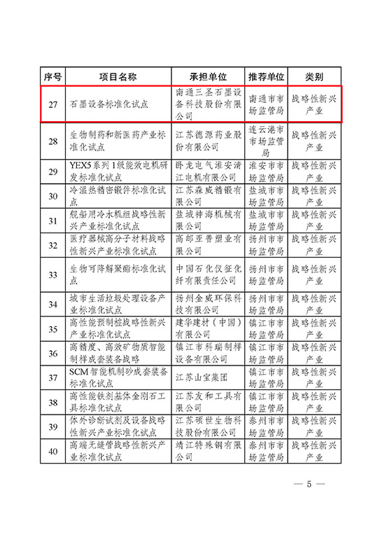 南通三圣標準化工作再傳捷報,公司申報的“石墨設備標準化試點”項目獲得江蘇省市場監(jiān)督管理局、江蘇省發(fā)展和改革委員會正式立項,成為2022年江蘇省戰(zhàn)略性新興產(chǎn)業(yè)標準化試點41個項目之一,也是南通市獲此立項的兩個項目之一 。