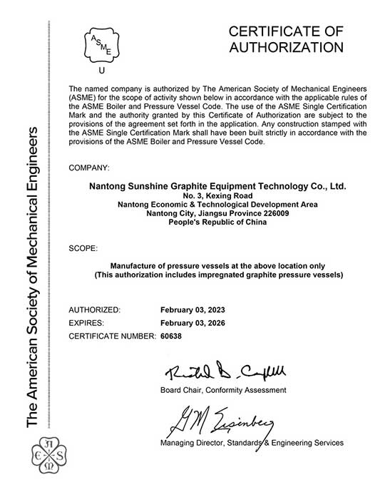 獲得ASME “U”鋼印認證標志著南通三圣在石墨設(shè)備制造方面的實力得到了國際權(quán)威的認可。這不僅體現(xiàn)了公司在研發(fā)、生產(chǎn)和質(zhì)量控制方面的優(yōu)秀表現(xiàn),也是對公司持續(xù)創(chuàng)新和環(huán)保理念的有力證明。