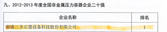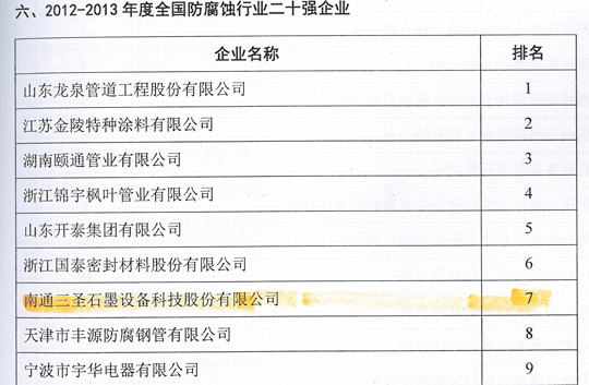 在剛剛閉幕的第五屆中國國際腐蝕控制大會上,南通三圣石墨設(shè)備科技股份有限公司憑借其優(yōu)異的業(yè)績榮登三大榜單,分別是:"2012-2013年度全國防腐蝕行業(yè)二十強(qiáng)企業(yè)"(排名第7位);"2012-2013年度全國非金屬壓力容器企業(yè)二十強(qiáng)"(排名第1位);"2012-2013年度全國防腐蝕行業(yè)外貿(mào)出口企業(yè)二十強(qiáng)"(排名第6位)。
