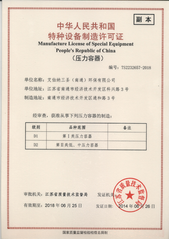 日前,艾伯納三圣(南通)環(huán)保有限公司順利取得了由江蘇省質(zhì)量技術(shù)監(jiān)督局頒發(fā)的《中華人民共和國特種設(shè)備制造許可證》。獲準(zhǔn)從事D1(第Ⅰ類壓力容器)、D2(第Ⅱ類低、中壓力容器)的制造,標(biāo)志著艾伯納三圣壓力容器生產(chǎn)的正式開始。